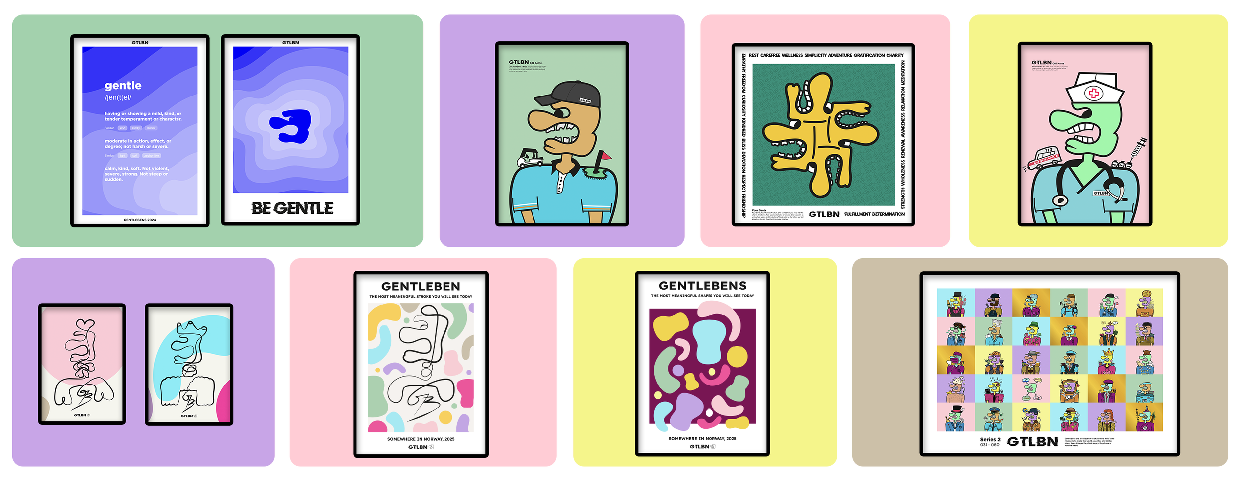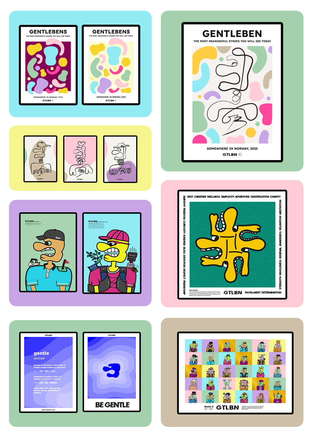 Hvert av disse 100 verkene selges som fysiske prints (kun tilgjengelig i Norge), og de første 60 av de også som NFTs (Non-fungible tokens). Hver GentleBen finnes i ulike fargekombinasjoner, men med et limitert opplag av hver karakter, noe som gjør de både unike og sjeldne.